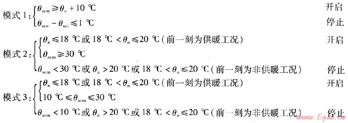 ③ 模式3:太陽(yáng)能熱泵供暖。供暖過(guò)程中,當(dāng)太陽(yáng)輻射較強(qiáng)時(shí),集熱器內(nèi)介質(zhì)的溫度不能滿足直接供暖的要求,但可以滿足熱泵供暖的要求。閥門7、11、14、9、4、1、12、15開(kāi)啟,其余關(guān)閉。
