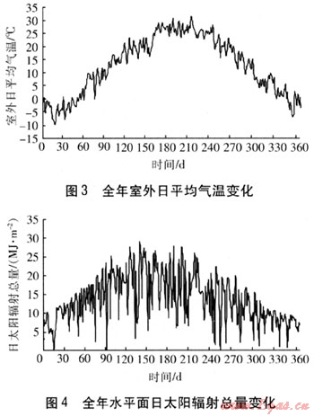 在模擬分析中,采用中國(guó)氣象局氣象信息中心提供的建筑熱環(huán)境氣象數(shù)據(jù)集中北京地區(qū)典型年的氣象數(shù)據(jù)[12]。全年室外日平均氣溫及水平面日太陽(yáng)輻射總量見(jiàn)圖3、4。由圖3、4可知,在非供暖期,室外溫度較高,太陽(yáng)輻射較強(qiáng),可以把這部分太陽(yáng)能儲(chǔ)存到地下坑槽中,供暖期再用熱泵提取,進(jìn)行供暖。在供暖期,太陽(yáng)輻射與建筑熱負(fù)荷在時(shí)間上不同步,供暖初期和末期,太陽(yáng)輻射較強(qiáng),室外平均溫度較高,熱負(fù)荷較小;供暖中期,室外平均溫度較低,熱負(fù)荷較大,太陽(yáng)輻射較弱。因此,在供暖初期和末期,優(yōu)先利用集熱器收集的太陽(yáng)能供暖,減少熱泵的耗電量,提高系統(tǒng)的性能。
