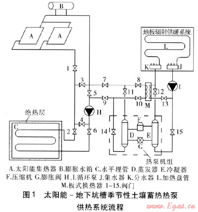 太陽(yáng)能-地下坑槽季節(jié)性土壤蓄熱熱泵供熱系統(tǒng)流程見(jiàn)圖1。