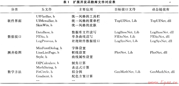 表1為用戶擴(kuò)展開發(fā)中常用函數(shù)庫,這5類函數(shù)庫都進(jìn)行了面向?qū)ο蠓庋b,可以較好地滿足各種層次開發(fā)人員的編程需要。表1中簡單地列出了單條曲線(常規(guī)、陣列)管理的基礎(chǔ)類CFIDi0和常規(guī)處理程序數(shù)據(jù)接口函數(shù)類Cl。ogProcess,以及用于測井繪圖和數(shù)據(jù)分析的函數(shù)類;C++程序開發(fā)人員可以按照Microsoft Visual Studio.net規(guī)則調(diào)用其中的類或函數(shù)來輕松完成用戶所需要的二次開發(fā)。