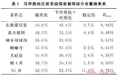 烏審旗地區(qū)煤巖顯微組分中鏡質(zhì)組平均含量為57.85%,半絲和絲質(zhì)組平均含量39.65%,穩(wěn)定組含量為1.82%,總體來說鏡質(zhì)組和絲質(zhì)組含量均屬中等,如表1所示。