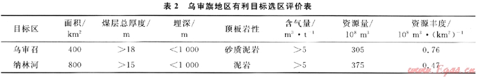 根據(jù)上述分析,按照煤層總厚度大于10m,埋深在1000m以淺,煤層頂板為泥巖、砂質(zhì)泥巖,煤層含氣量大于5m3/t等選區(qū)評價(jià)標(biāo)準(zhǔn),綜合分析各個(gè)區(qū)塊的煤層氣地質(zhì)條件,結(jié)論認(rèn)為:北部烏審召區(qū)塊和南部納林河區(qū)塊是煤層氣有利勘探目標(biāo)區(qū),2個(gè)區(qū)塊含煤總面積為1200km2,煤層氣資源量達(dá)680×108m3(圖3、表2)。