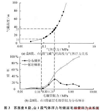 研究區(qū)區(qū)域構(gòu)造平緩,通過(guò)對(duì)大量盒8段、山1段氣藏剖面統(tǒng)計(jì),滲透性好、橫向連通好的氣層連續(xù)高度主要分布在10~35m,一般不超過(guò)40m。根據(jù)上述公式計(jì)算得研究區(qū)盒8段、山1段氣藏天然氣向上浮力介于0.08~0.28MPa。