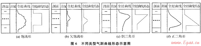 曲線形態(tài)包括:①飽滿(mǎn)形——全烴顯示厚度比儲(chǔ)層厚度大或基本相等,說(shuō)明氣充滿(mǎn)了整個(gè)儲(chǔ)層,此形態(tài)最好,一般解釋為氣層;②欠飽滿(mǎn)形~全烴顯示厚度小于儲(chǔ)層厚度,儲(chǔ)層含氣不飽滿(mǎn),上氣下水,解釋為氣水同層或差氣層;③倒三角形——曲線前沿陡,后沿緩慢回落,高點(diǎn)在上部,儲(chǔ)層頂部有少量游離氣,呈氣帽特征,解釋為氣層或含氣水層;④正三角形——曲線前沿緩慢爬升,后沿陡,高點(diǎn)在下部,水中溶解的氣欠飽和,頂部無(wú)游離氣,解釋為含氣水層或水層。