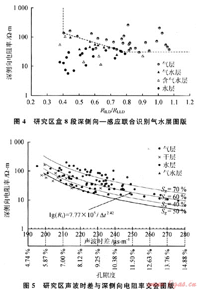 據(jù)研究區(qū)已試探井資料制作了聲波時(shí)差-一一深側(cè)向電阻率交會(huì)圖版(圖5)。依據(jù)阿爾奇公式,在圖版中作等飽和度曲線,從中可發(fā)現(xiàn),研究區(qū)氣層的含氣飽和度在60%以上,與地質(zhì)情況吻合,該圖版應(yīng)用于研究區(qū)探井測(cè)井解釋?zhuān)下食^(guò)90%,應(yīng)用效果良好。