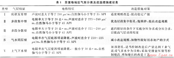 蘇里格地區(qū)砂體特征從平面上看儲(chǔ)層厚度、物性特征變化較大,非均質(zhì)性較強(qiáng)。從縱向上看:部分儲(chǔ)層含水,氣水關(guān)系復(fù)雜。針對(duì)此特點(diǎn),結(jié)合試氣工藝方案的優(yōu)化,將蘇里格地區(qū)盒8段、山1段儲(chǔ)層按縱向砂體、氣層結(jié)構(gòu)的差異分成5類(lèi),分別提出了針對(duì)性的改造措施建議,以獲得更好的試氣效果(表1)。