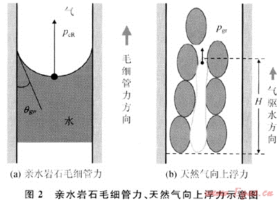 天然氣向上浮力(圖2-b)在儲(chǔ)層中的大小與氣柱連續(xù)高度和氣、水密度差成正比。計(jì)算公式如下: