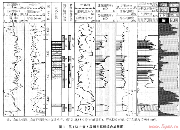 所示,研究區(qū)內(nèi)蘇173井盒8段氣層1和氣層2射孔段分別為3612.0~3614.0m、3642.0~3644.0m,兩段分壓合求,試氣獲井口產(chǎn)量1.8838×104m3/d,產(chǎn)水13.0m3/d。研究區(qū)試氣出水井基本都呈現(xiàn)出高阻的特征,給測(cè)井識(shí)別氣、水層帶來(lái)了很大網(wǎng)難。