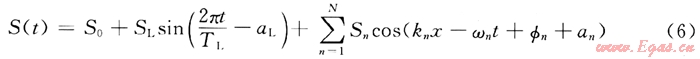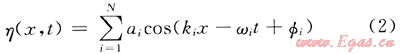 使用描述波浪的郎格-赫金斯(Longuet-Higgins)模型,波浪可由若干個(gè)不同周期、不同波高、不同相位角的簡單余弦波進(jìn)行線性疊加來模擬。長峰波浪可以表示為: