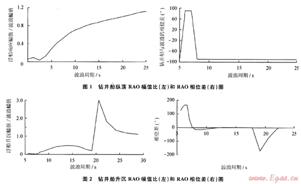 鉆井船的響應(yīng)幅值算子(Response Amplitude Operator,簡稱RAO)可以用來模擬鉆井船對(duì)特定波的響應(yīng)。響應(yīng)幅值算子包括幅值傳遞函數(shù)與相位傳遞函數(shù)。前者確定了不同波浪周期時(shí),鉆井船響應(yīng)與對(duì)應(yīng)組成波的幅值比;后者確定了不同波浪周期時(shí),鉆井船響應(yīng)與對(duì)應(yīng)組成波的相位差。圖1中是鉆井船縱蕩RAO幅值比和相位差。
