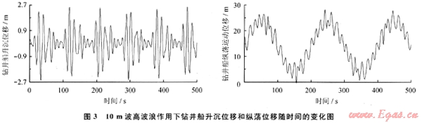圖3是在10m波高波浪作用下鉆井船升沉位移和縱蕩位移隨時(shí)間的變化??紤]鉆井船的平均偏移為14m,假設(shè)慢漂運(yùn)動(dòng)的單邊幅值為10m,慢漂運(yùn)動(dòng)的周期為200s,波浪的有效波高為10m。