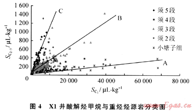 據(jù)此X1井須5段烴源巖以C類為主;須4段以C類、B類為主;須3段以8類為主,少部分偏C類和A類;須2段以A類為主,少部分偏C類和B類;小塘子組以A類為主,見圖4(圖中SC2~5表示酸解烴重烴含量)。