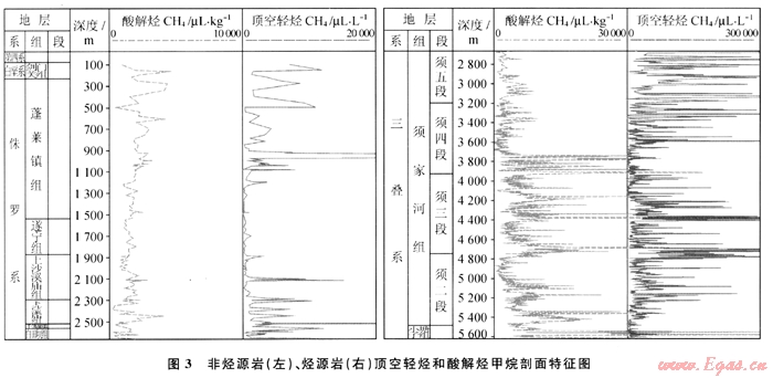 酸解烴所測的是歷史時期被礦物顆粒吸附和膠結(jié)物所捕獲的甲烷及其同系物,一般認為其能夠反映歷史時期烴源巖的生烴特征和早期烴類大規(guī)模運移特征,是歷史累積效應(yīng)的反映;而頂空輕烴所測是目前巖石礦物顆??紫?、裂縫中的甲烷及其同系物,反映的是現(xiàn)今地層含油氣特征及最近一期大規(guī)模運移特征。
