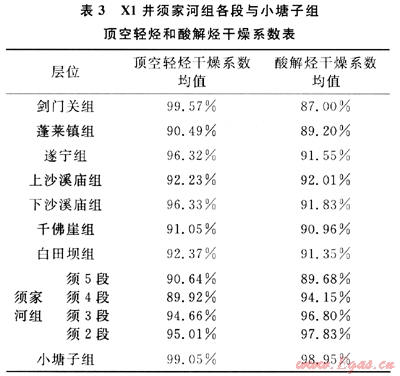 另外,一般烴類從烴源巖到儲層或者蓋層的運移,如無外源加入,甲烷運移速度最快,總會在運移路徑上呈干燥系數(shù)變大的特點。但是X1井干燥系數(shù)在須家河組各段和小塘子組從下至上明顯逐漸減小。分析認為此特征應(yīng)為烴源巖生烴作用造成,因此也可確定須家河組和小塘子組為烴源巖層(表3)。