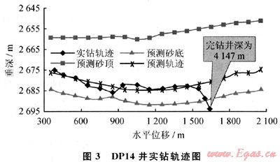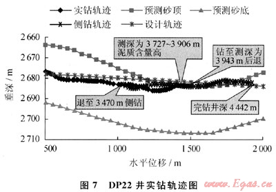DP22井在水平段的氮氣泡沫欠平衡鉆進過程當(dāng)中實現(xiàn)了隨鉆點火,火焰高4~6m,后效火焰高9~11m,油氣顯示非?;钴S。DP22井在井深3727~3906m井段伽馬值偏高,判斷為鉆遇泥巖夾層,后退至3470m處進行懸空下切側(cè)鉆,后鉆至井深4442m處完鉆,由于后退下切側(cè)鉆導(dǎo)致氮氣泡沫實鉆進尺超過1900m。在最后一趟鉆起鉆過程中出現(xiàn)了卡鉆事故。事故原因為沉沙卡鉆,最后一趟鉆總進尺為281.54m,平均機械鉆速為11.04m/h,在鉆井過程中伽馬值偏高,同時出口處沒有巖屑返出。圖7給出了DP22井氮氣泡沫欠平衡水平段實鉆軌跡。