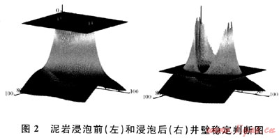 圖2給出了盒1段氣層泥巖浸泡前(左)和浸泡后(右)井壁穩(wěn)定判斷圖。從圖2中可以明顯看出:鉆井液浸泡前井壁穩(wěn)定,只有局部有輕微剝落掉塊;鉆井液浸泡后井壁穩(wěn)定性下降,井壁開始出現(xiàn)大范圍垮塌失穩(wěn)。因此,泡沫鉆井液鉆遇泥巖或泥質(zhì)條帶存在失穩(wěn)風(fēng)險。