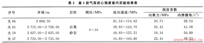 表2給出了盒1段氣層巖心強度室內(nèi)實驗結(jié)果,從表2中可以看出在圍壓為10MPa時,巖石的平均抗壓強度為116.8MPa,而通過模擬計算在氮氣介質(zhì)下的井內(nèi)最大應(yīng)力為93.95MPa,因而不會出現(xiàn)井壁失穩(wěn)[7]。