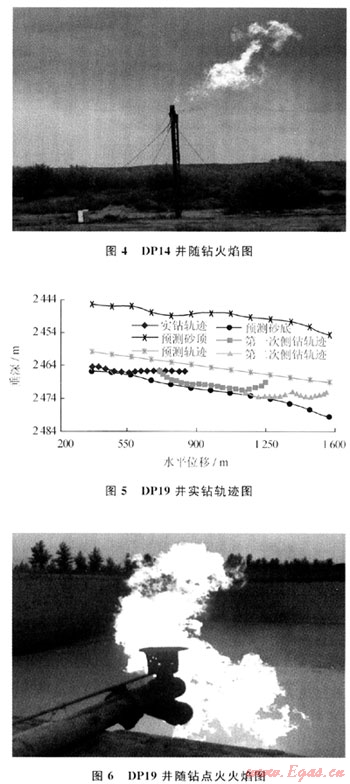 DP19井采用氮氣泡沫欠平衡鉆水平井技術(shù),實現(xiàn)了隨鉆點火,火焰高達3~5m。在欠平衡水平段的鉆井過程中由于兩次鉆遇大段泥巖,進行了兩次后退懸空下切側(cè)鉆繞泥,導(dǎo)致氮氣泡沫欠平衡實鉆進尺超過1500m,在整個欠平衡水平段鉆井過程中沒有出現(xiàn)井壁失穩(wěn)。圖5給出了DP19井氮氣泡沫欠平衡水平段實鉆軌跡,圖6給出了DP19井隨鉆點火情況。