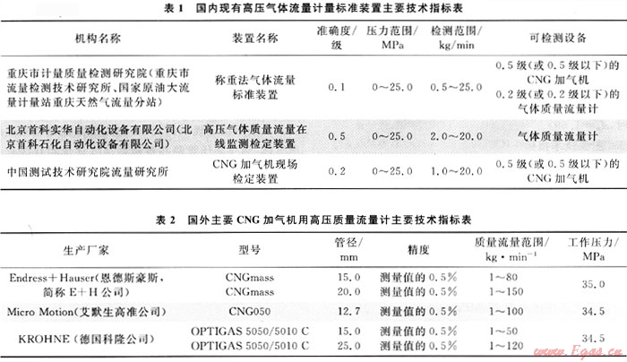 我國(guó)尚未建立高壓氣體流量計(jì)量國(guó)家標(biāo)準(zhǔn),迫切需要建立作為科研服務(wù)和量值傳遞標(biāo)準(zhǔn)的高壓氣體流量計(jì)量標(biāo)準(zhǔn)裝置,并在此基礎(chǔ)上建立CNG加氣機(jī)及高壓氣體流量計(jì)量檢測(cè)中心,以滿足我國(guó)對(duì)高壓氣體流量計(jì)量檢定的需要,也為國(guó)際天然氣貿(mào)易結(jié)算的公平、公正計(jì)量提供有力的檢測(cè)手段[3~6]。表2給出了國(guó)外主要CNG加氣機(jī)用高壓氣體質(zhì)量流量計(jì)的生產(chǎn)廠家及產(chǎn)品技術(shù)指標(biāo)。