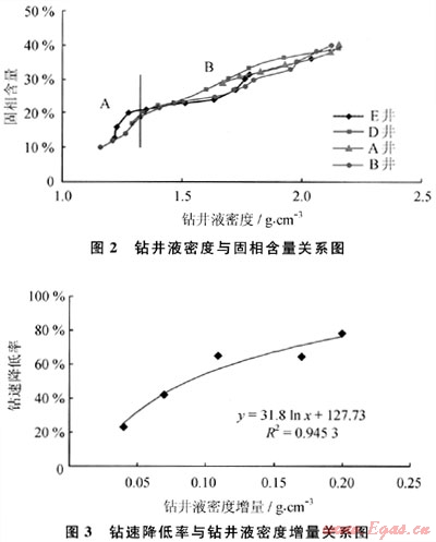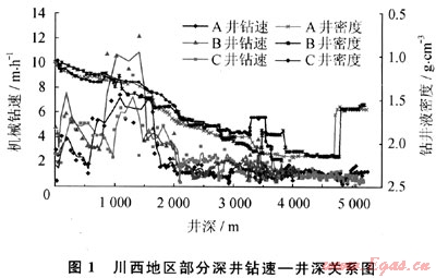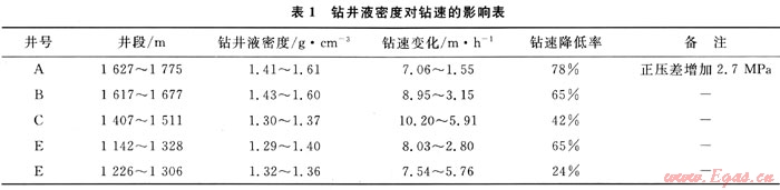 通過統(tǒng)計(jì)分析川西地區(qū)5口深井實(shí)鉆資料,認(rèn)為以下鉆井液因素對(duì)鉆速存在影響。