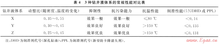 在綜合調(diào)研國(guó)內(nèi)外深井鉆井液體系的基礎(chǔ)上,結(jié)合川西地區(qū)深井的工程地質(zhì)特征及鉆井液的現(xiàn)場(chǎng)應(yīng)用情況,選擇在川西地區(qū)應(yīng)用比較成功的X、Y和Z等3種鉆井液體系進(jìn)行室內(nèi)評(píng)價(jià),根據(jù)配方進(jìn)行配制的鉆井液,對(duì)其流變性、抑制性、潤(rùn)滑性及抗溫、抗鹽膏能力進(jìn)行了系統(tǒng)的評(píng)價(jià)(表4)。結(jié)果表明,3種鉆井液體系具有各自的特點(diǎn)和適用范圍,X鉆井液屬于不分散鉆井液體系,對(duì)提高鉆井速度很有幫助,但是其在耐溫性和固相容量限兩個(gè)方面存在問題。當(dāng)?shù)貙訙囟瘸^80℃時(shí),X鉆井液體系的性能開始惡化,穩(wěn)定性變差,失水量增加;而當(dāng)鉆井液密度過高時(shí),由于受到X鉆井液容量限的限制,鉆井液性能會(huì)整體變差。因此,X鉆井液體系只適應(yīng)于淺井段的鉆井。