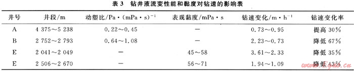 鉆井液流變性能和黏度是影響鉆速的重要因素,其好與差可導(dǎo)致超過30%的鉆速變化(表3)。因此,在鉆井中應(yīng)注意維護(hù)鉆井液良好的流變性能和合適的黏度,以此來提高鉆井速度。