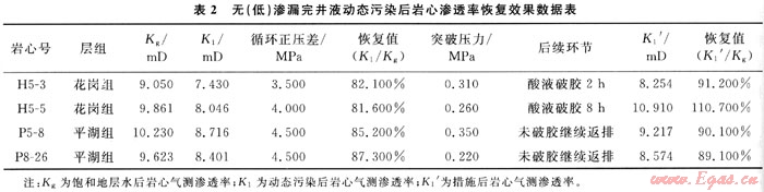 滲透率恢復(fù)值為120~130,但有沉淀、分層和絮凝,說明與地層水的配伍性良好。但是為考察無(低)滲漏完井液體系在高溫作用下的保護儲層效果即巖心滲透率恢復(fù)值情況,選取目標層4塊巖心進行完井液動態(tài)污染實驗,實驗溫度為120~130℃,動態(tài)循環(huán)正壓差為3.5~4.5MPa,實驗數(shù)據(jù)見表2。