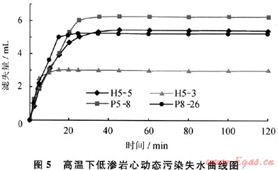 濾失性無(低)滲漏完井液體系在動態(tài)污染試驗的前20min,5塊巖心動態(tài)失水速率普遍較大,這可能是因為軟顆粒狀完井液受擠壓時發(fā)生的物理脫水現(xiàn)象,但總量均沒有超過7mL。20min左右,致密的碳化膠質(zhì)暫堵層逐漸形成,加上軟顆粒本身的物理暫堵功能,雙重暫堵下巖心基本不再發(fā)生濾失(圖5),說明無(低)滲漏完井液高溫下與巖心接觸時發(fā)生的化學(xué)質(zhì)變有利于控制完井液的失水滲漏。從濾失量減少為0的時間可看出,膠質(zhì)暫堵層在120~130℃下形成的時間在20min左右,最低的約6min,如H5-3號巖心,6min左右濾失量就降至為0,這可能與巖心中的黏土礦物類型和總含量有關(guān)。