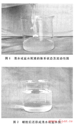 無(低)滲漏完井液主要由有機高分子吸水材料膠凝劑、絡(luò)合淡水中二價陽離子的螯合劑、調(diào)節(jié)流變性的穩(wěn)定劑組成?;九浞綖椋旱?0.5%螯合劑YF-1+1%~2%膠凝劑SW-1+0.5%穩(wěn)定劑WDJ-1。完井液由毫米級的軟顆粒組成,顆粒尺寸分布在0.5~3mm,軟顆粒易變形,有一定強度,該完井液體系用酸液能完全破膠,并能還原成清水(圖1、2)。