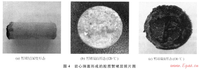 從表2中實驗數(shù)據(jù)可知:低滲巖心自然反排的突破壓力較低,均小于0.4MPa,滲透率恢復(fù)值均超過80%,如果反排時間繼續(xù)延長,巖心滲透率恢復(fù)值還可繼續(xù)得以恢復(fù),無(低)滲漏完井液所形成的暫堵層完全可以自然解堵,在完井和修井結(jié)束后,無論采用連續(xù)油管或氣舉都很容易誘噴解堵。用酸液破膠后,巖心的滲透率恢復(fù)值會繼續(xù)增加,甚至可超過100%,但對于低滲透氣藏,為減少液相部分滯留而造成水相圈閉損害,不推薦采用酸液破膠。另外,實驗中有了新發(fā)現(xiàn):巖心端面在高溫下形成了一種黃至黑色膠質(zhì)致密暫堵層,有一定強度,不能用手輕易刮開,深度約3mm(圖4-a),且隨著實驗溫度增加暫堵層顏色加深(圖4-b、c),認為是有機高分子完井液在接觸巖心時發(fā)生碳化(熱催化)反應(yīng)所得,這與新型完井液體系的構(gòu)建思路基本一致。