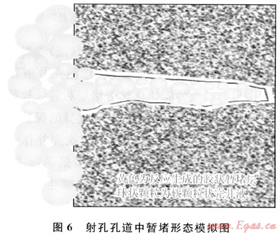 根據(jù)化學(xué)反應(yīng)定律中溫度時間互為補償理論[11],在射孔期間巖石瞬間的高溫便可加速擠入炮眼中的有機高吸水材料的碳化(熱催化)反應(yīng),碳化暫堵層的形成時間將大為縮短,可有效降低完井液的漏失。雙重暫堵模型見圖6。