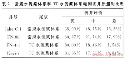 TC柔性水泥漿體系在蘇丹6區(qū)7口井的Φ244.5mm中間套管固井中得到了成功應用,聲波測井結果為:優(yōu)質率平均提高30%以上,不合格率平均下降了15%。表2是蘇丹6區(qū)采用常規(guī)水泥漿體系和TC水泥漿體系封固Φ244.5mm套管的固井質量對比結果,分別取自各井完井前CBL電測評價資料,數(shù)據(jù)顯示應用TC柔性水泥漿體系后固井質量顯著提升。