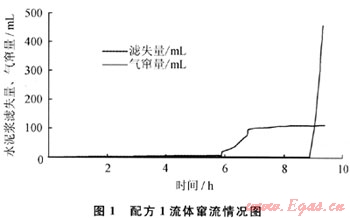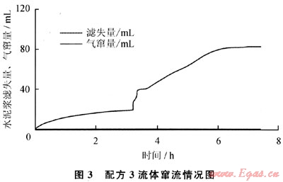 圖3所示為配方3水泥漿氣竄試驗(yàn)的流體竄流情況。從圖3中可知,向含有降失水劑F1的水泥漿中摻入一定量的膠乳類防氣竄劑A后,由于該類防氣竄劑可以通過在水泥漿內(nèi)部擠壓成膜等作用來限制氣體在水泥漿中的運(yùn)移,提高了該水泥漿在候凝期間的內(nèi)部結(jié)構(gòu)阻力,因而極大地提高了該水泥漿的防氣竄能力。