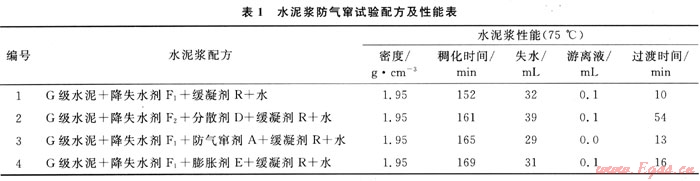 使用作者所述的水泥漿防氣竄性能評(píng)價(jià)方法,對國內(nèi)一些氣田的尾管固井水泥漿配方進(jìn)行了研究。研究表明,現(xiàn)場固井效果和室內(nèi)結(jié)果有很好的一致性。下面給出一些代表性的實(shí)例: