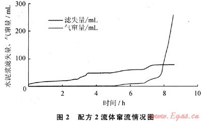 圖2所示為配方2水泥漿氣竄試驗(yàn)的流體竄流情況。降失水劑F2通過在氣液界面成膜來控制失水,從圖2可以得知,對于該水泥漿配方,雖然降失水劑F2通過在水泥漿與地層交界處形成一種耐壓膜,一定程度上限制了氣體對水泥漿的侵入,但是由于在試驗(yàn)溫度下該降失水劑成膜的穩(wěn)定性不佳,不能有效降低候凝期間該水泥漿配方的滲透率。因此,后期氣體還是能不斷置換水泥漿內(nèi)流體,最后發(fā)生了竄流。