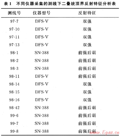 表1列出了不同年度、不同儀器采集的部分二維疊加剖面下二疊統(tǒng)頂界反射特征。從表1中看出:SN-388采集的大多數(shù)測線陽新統(tǒng)頂界反射特征為前強后弱的單強相位,與三維剖面下二疊統(tǒng)頂界反射為單強相位特征相近。而DFS-V數(shù)字地震儀采集的大多數(shù)測線下二疊統(tǒng)頂界反射特征為雙強相位。由此得出:DFS-V儀器采集的二維資料與三維資料特征不一致,反射特征差異是由儀器響應(yīng)的不同而引起的。