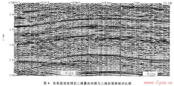 通過以上分析,認為WBC構(gòu)造二維資料與三維資料特征差異的主要原因是由于不同儀器接收的原始記錄不同造成。采用反極性處理和匹配濾波處理兩種方式對二維剖面進行相位調(diào)整,其特征與三維剖面均相近,但反極性處理存在約20ms的時差,且相位相反。匹配濾波處理無此現(xiàn)象,但是匹配濾波處理也有少數(shù)反射層特征不一致的地方。這可能是由采集的原始資料的差異所致。