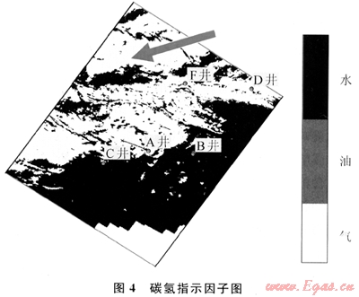 對比反演結(jié)果圖,發(fā)現(xiàn)圖4指示的含氣范圍(黃色區(qū)域)、氣水界面以及與各井含油氣性與實鉆結(jié)果吻合。需要強(qiáng)調(diào)的是:該技術(shù)對B井的預(yù)測與實鉆結(jié)果吻合,更接近地質(zhì)認(rèn)識。但是PY地區(qū)F井北部有一處面積達(dá)20km2的高含氣區(qū)(箭頭所示),需要進(jìn)一步評價、落實該地區(qū)的含油氣性。