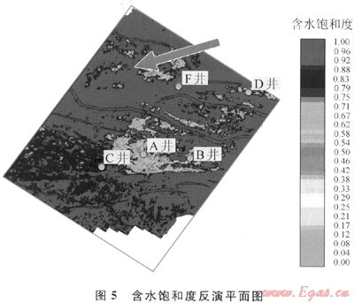 多屬性反演技術(shù)即是利用測井曲線和地震數(shù)據(jù)的關(guān)系“預(yù)測”或估測地震體上所有點的測井曲線特征體。利用基于神經(jīng)網(wǎng)絡(luò)的多屬性反演技術(shù)得到了研究區(qū)的含水飽和度圖5。綜合分析圖4、5,認(rèn)為圖4所示的F井北部應(yīng)是一個相對高含水的區(qū)域,其余各井儲層含油氣性的預(yù)測結(jié)果與實鉆結(jié)果較符合(圖5)。