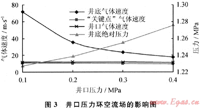 從井口壓力對(duì)環(huán)空流場(chǎng)的影響曲線(圖3)可以看到,井口壓力從0.1MPa增加到0.4MPa,井口、“關(guān)鍵點(diǎn)”、井底氣體速度分別減小75%、6.0%、3.8%,井底壓力增加3.99%,井口加載一定回壓后,上部井段環(huán)空流速明顯減小,削弱了夾雜固體顆粒的高速氣流對(duì)環(huán)空井壁和鉆具的沖蝕作用,而井口回壓的增加并不會(huì)明顯影響井底壓力。所以,通過(guò)在井口加載一定回壓,可實(shí)現(xiàn)對(duì)上部井段環(huán)空流場(chǎng)的改善。
