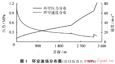 采用建立的計(jì)算模型,對(duì)氣體鉆井環(huán)空流體動(dòng)力學(xué)進(jìn)行了數(shù)值模擬。根據(jù)壓力分布圖可知(圖1),在下部井段(尤其是鉆鋌段)環(huán)空壓力下降較快,鉆鋌段長(zhǎng)度僅占總井深的3.97%,壓降卻達(dá)到了整個(gè)環(huán)空壓降的20.8%。環(huán)空速度場(chǎng)沿井深分布不均,在“關(guān)鍵點(diǎn)”(實(shí)質(zhì)是鉆鋌與鉆桿連接處、存在截面突變那一段)和井底,氣流速度分別為10.01m/s和11.49m/s,該處容易出現(xiàn)井眼凈化不良的問(wèn)題。氣體在向上運(yùn)移過(guò)程中,減壓膨脹,到達(dá)井口時(shí),流速達(dá)到71.61m/s,是“關(guān)鍵點(diǎn)”氣流速度的7.15倍,遠(yuǎn)遠(yuǎn)超出了井眼凈化的要求,夾雜固體顆粒的高速氣流必將對(duì)環(huán)空井壁和鉆具造成沖蝕。