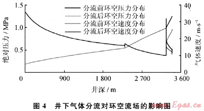 通過(guò)井下氣體分流器(DHAD)分流20m3氣體后(圖4),環(huán)空氣體分流處產(chǎn)生了約0.3MPa的局部壓降,井底壓力降低了21.2%。下部井段環(huán)空壓力降低,氣體膨脹,流速加快,攜帶巖屑能力得以提升。實(shí)現(xiàn)了改善下部井段環(huán)空流場(chǎng),降低井底壓力和注氣壓力的目的。數(shù)值模擬表明采用全井段環(huán)空流場(chǎng)改善方法可實(shí)現(xiàn)以下目的。