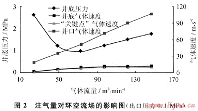 取不同注氣量對(duì)氣體鉆井環(huán)空流場(chǎng)進(jìn)行了數(shù)值模擬,結(jié)果表明:井底壓力隨注氣量的增加先減后增,存在一個(gè)臨界點(diǎn)(圖2)。計(jì)算條件下,注氣量從97.96m3/min增加到146.94m3/min,“關(guān)鍵點(diǎn)”、井底氣體速度僅增加4.4%和4.0%,而井口氣流速度卻增加了近5倍。所以超過(guò)一定值后,繼續(xù)增加注氣量,并不能有效提高下部井段氣流速度,從而提高下部井段井眼凈化能力,反而會(huì)導(dǎo)致上部井段沖蝕嚴(yán)重和水力能量的不必要浪費(fèi)。