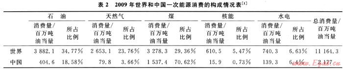 與世界相比,中國(guó)一次能源消費(fèi)結(jié)構(gòu)更不合理(表2),單位能耗的C02排放量較大。中國(guó)化石能源占總量的92.8%,而世界為87.89%;中國(guó)化石能源的主體是煤炭,占70.62%,而世界為29.36%。化石能源中C02排放量相對(duì)較低的天然氣,在中國(guó)能源構(gòu)成中僅占3.66%,而世界為23.6%;非化石能源中水電的比例中國(guó)與世界相近,但核能僅為0.73%,而世界為5.47%(表2)。由此可見,中國(guó)降低C02排放、改善能源結(jié)構(gòu)的任務(wù)更加艱巨。