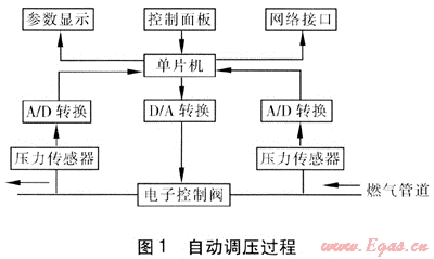 操作者通過控制中心遠(yuǎn)程或控制面板現(xiàn)場設(shè)定出口壓力值。在現(xiàn)場站點的入口和出口處均設(shè)有壓力傳感器,實時將入口、出口側(cè)的壓力信號經(jīng)模擬/數(shù)字信號(A/D)轉(zhuǎn)換器輸入單片機,并可在液晶屏幕上實時顯示。當(dāng)出口壓力低于設(shè)定值時,單片機發(fā)出的數(shù)字控制信號經(jīng)數(shù)字/模擬信號(D/A)轉(zhuǎn)換器轉(zhuǎn)換后輸出模擬電流信號至燃?xì)夥辣娮涌刂崎y,電子控制閥流量增大直至出口壓力達(dá)到設(shè)定值。當(dāng)出口壓力高于設(shè)定值時,單片機發(fā)出控制信號經(jīng)數(shù)字/模擬信號(D/A)轉(zhuǎn)換器轉(zhuǎn)換后輸出模擬電流信號至燃?xì)夥辣娮涌刂崎y,電子控制閥流量減小直至出口壓力達(dá)到設(shè)定值。當(dāng)入口壓力過低或者過高、超出警戒值時,系統(tǒng)可以在現(xiàn)場顯示報警,也可以通過網(wǎng)絡(luò)接口上報控制中心。系統(tǒng)可選用512 kb儲存器作為人機交互系統(tǒng)的外部儲存器,用來儲存設(shè)置參數(shù)等信息,這樣可以將壓力數(shù)據(jù)儲存并按要求進(jìn)行統(tǒng)計以供顯示或上傳調(diào)用。