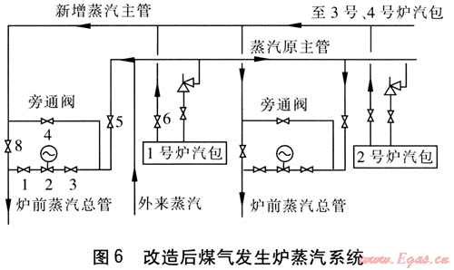 針對以上問題,我們對蒸汽系統(tǒng)進行了改進:①重新布置1根長度為40m、外徑為108mm的無縫鋼管作為自產(chǎn)蒸汽的主管道(即新增自產(chǎn)蒸汽主管)。②將4臺煤氣發(fā)生爐汽包的出汽管與原主管分開后,接到新增自產(chǎn)蒸汽主管上。③在新增自產(chǎn)蒸汽主管至每臺煤氣發(fā)生爐飽和管之間加1個DN 100mm的截止閥(8號閥)。④將原來旁通閥(4號閥)由截止閥改為閘閥。改造后煤氣發(fā)生爐蒸汽系統(tǒng)見圖6。