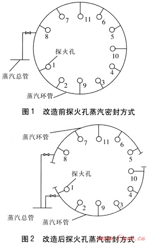 改造方案是:將原來的蒸汽環(huán)管從中間截斷成兩半,一半沿用原來的探火蒸汽管和閥門,只是將兩端用堵頭堵住,主要用來密封5、6、7、8、11號探火孔;用1根直徑為40mm的無縫鋼管從蒸汽總管引至另一半環(huán)管上,加裝1個DN 40mm的截止閥作為控制用,這一半環(huán)管主要用來密封1、2、3、4、9、10號探火孔。經(jīng)過這一改進后,提高了密封煤氣的蒸汽壓力,解決了在探火時因蒸汽壓力較低而造成密封效果較差、煤氣泄漏嚴(yán)重的問題。