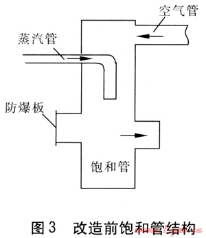 ④ 飽和管上裝有1塊0.5mm厚的退火鋁板作為防爆板,用于爐底部發(fā)生爆炸時泄壓。一方面,發(fā)生爐爐底爆炸時由于該防爆板采用平裝方式(見圖3),爆炸波和鋁片易傷到人;另一方面,蒸汽凝結(jié)水易對鋁板造成腐蝕,導(dǎo)致鋁板使用壽命縮短。