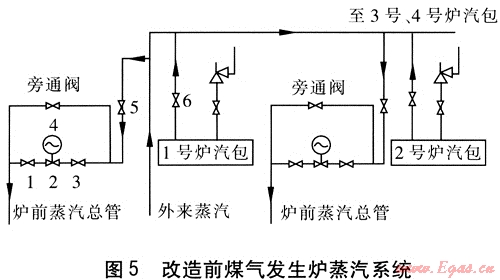 外來蒸汽的壓力一般在0.8MPa左右,經(jīng)過減壓閥減壓后最低保持在0.15MPa左右。煤氣發(fā)生爐自產(chǎn)蒸汽的壓力一般在0.045MPa左右,設(shè)計壓力不超過0.075MPa,經(jīng)過汽包匯集后與減壓后的外供蒸汽一起進入爐前蒸汽總管。改造前煤氣發(fā)生爐蒸汽系統(tǒng)見圖5。由于兩者壓力之差,導(dǎo)致外供蒸汽流入煤氣發(fā)生爐汽包,造成煤氣發(fā)生爐的自產(chǎn)蒸汽無法進入爐前蒸汽總管,汽包安全閥長年處于開啟放散狀態(tài),從而使大量的蒸汽浪費,存在汽包壓力持續(xù)超過設(shè)計要求的不安全因素。