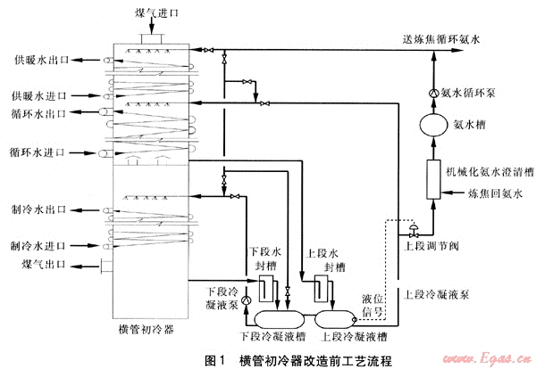 5臺橫管初冷器并聯(lián)操作,煤氣從橫管初冷器上部進入,為了保證初冷器對煤氣的冷卻效果,用水對煤氣分3段進行冷卻。上段冬季進水水溫為47℃,出水水溫為60℃,為合理利用熱量,將出水為附近居民供暖,回水再去上段冷卻煤氣,故該廠稱此水為供暖水。其余時間上段同中段一樣,用進水水溫為32℃、出水水溫為45℃的循環(huán)水對煤氣進行冷卻。下段用16℃制冷水將煤氣冷卻至18~22℃。為保證初冷器的冷卻除萘效果,在中、下段頂部連續(xù)噴灑焦油、氨水混合液,在上段頂部用熱氨水循環(huán)噴灑,以清除管壁上的焦油、萘等雜質。初冷器上、中段排出的冷凝液經水封槽流入上段冷凝液槽,用泵將其送入初冷器中段頂部循環(huán)噴灑,下段冷凝液槽內多余的部分送到機械化氨水澄清槽。初冷器下段排出的冷凝液經水封槽流入下段冷凝液槽,用泵將其送入初冷器下段頂部循環(huán)噴灑,下段冷凝液槽內多余部分流入上段冷凝液槽。橫管初冷器改造前工藝流程見圖1。